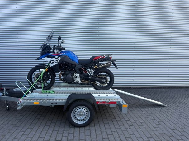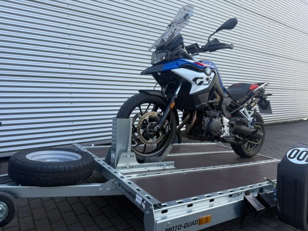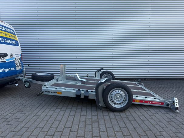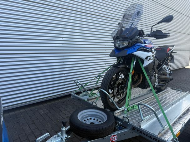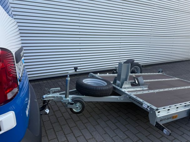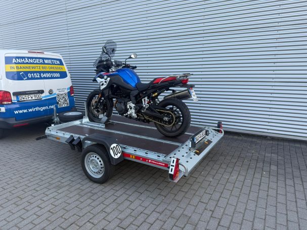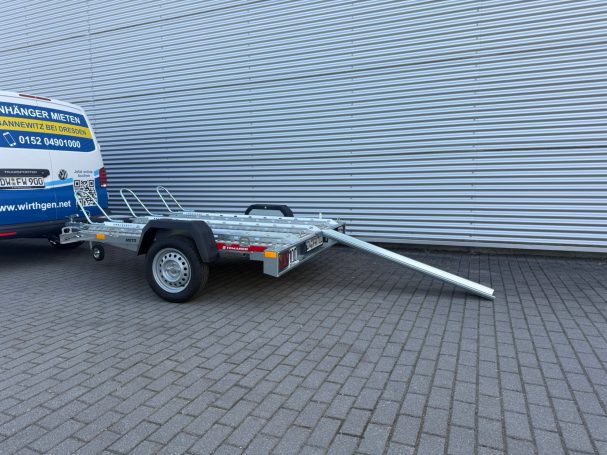 Spezialanhänger für den Transport von Motorrädern mit schwenkbarer Deichsel und mit der Auffahrrampe, die sich unter der Transportfläche befindet.