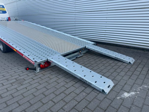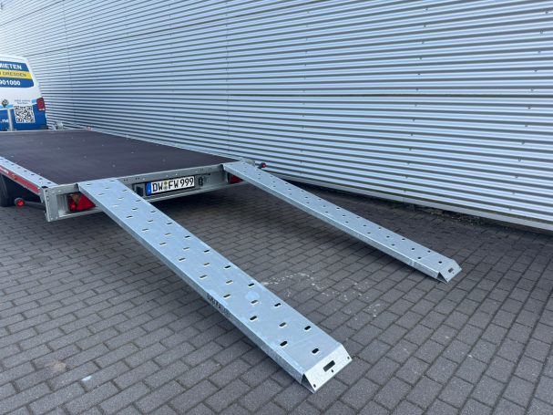 Fahrzeugtransportanhänger mit kippbarer Ladefläche. Der niedrige Auffahrwinkel (6°) ermöglicht das einfache Verladen von Fahrzeugen mit geringer Bodenfreiheit. Die Rampen sind unter der Ladefläche verborgen.