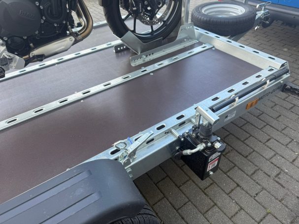 Plattform mit der Möglichkeit der hydraulischen Absenkung der Transportfläche zum Beladen von z.B. Motorrädern mit einem sehr geringen Anfahrwinkel.