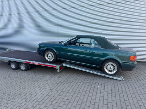 Universelle geschraubte Pritsche für den Transport von Autos. Schienen unter der Transportfläche einziehbar In den Längsträgern Halterungen zur Befestigung von Transportgurten.